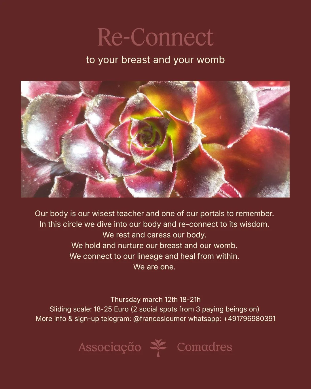 “Re-Connect with your WOMB and your BREAST ” with Frances Thursday 12 March 2026 18:00 21:00 Google Calendar ICS